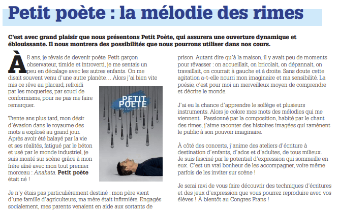 Pendant 1 heure 15, Petit poète vous emmène dans l’univers de son album « Premier acte ». Vous voulez programmer un spectacle? Contactez-le pour la fiche technique et les formules.